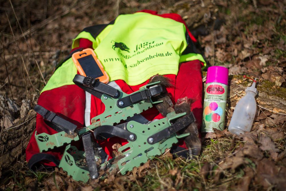 Fährtenschuhe, Markierungspray oder Markierungsband, Spritzflasche oder Tupfschwamm gehören zu den Ausbildungsgegenständen für die Fährtenarbeit.