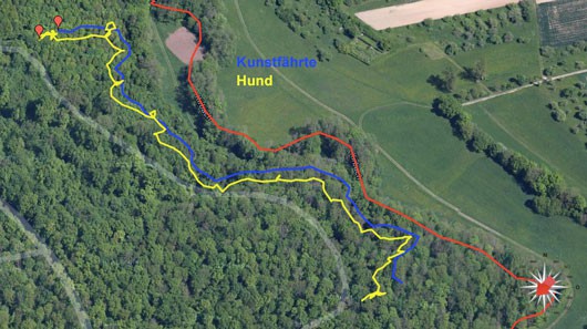 Die Suche des Hundes (gelb) weicht nur wenig von der am Vortag mit dem Fährtenschuh getretenen Kunstfährte (blau) ab. Man beachte rechts unten die Windanzeige – diese erklärt den leichten Versatz.