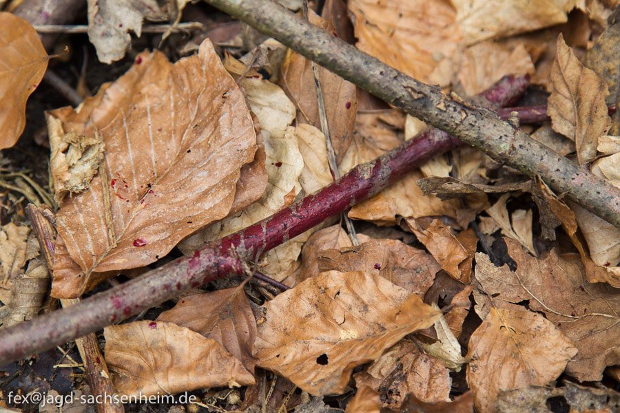 - Direkt am Anschuss Pirschzeichen zu finden sein, die auf eine sichere Totsuche schliessen lassen. Dies sind nach den Erfahrungen vieler anerkannter Nachsucheführer mit hunderten von Einsätzen ausschliesslich Lungenstücke. Lungenschweiss lässt sich nur sehr schwer von dem Schweiss unterscheiden, der bei Drossel- und Gebrächschüssen anzutreffen ist.
